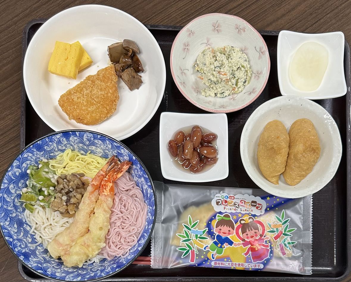 涼しげな3色の素麺には海老天を添えて、ボリューム満点ですね。