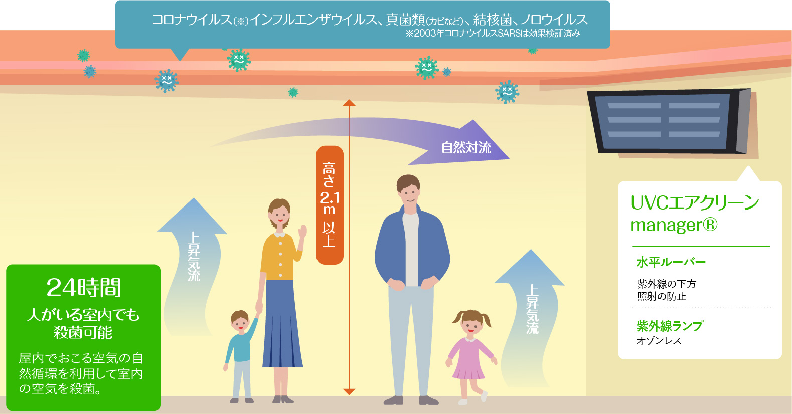今までは、殺菌灯では人体に直接紫外線が照射されるため、無人状態でしか使用できませんでした。UVCエアクリーンmanager®は、紫外線を水平方向だけに照射するためにルーバー構造を採用し、人体に直接紫外線が照射されることはありませんので、人がいる室内でも24時間使用できます。また、殺菌空間(2.1m以上)と生活空間(2.1m以下)に分かれているので、24時間安全に殺菌を行うことができます。